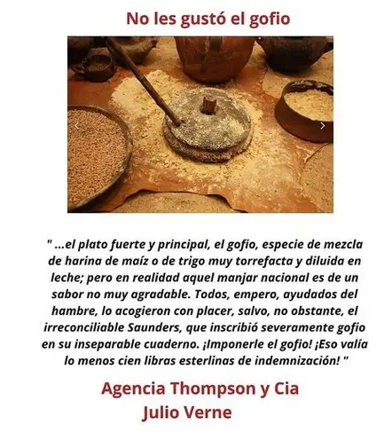 [A los canarios] aparte del acento caribeño sólo unía la desconfianza hacia la península y el amor enigmático y apasionado por el gofio, una harina o polenta cuya aparición en el cuartel, en el petate de alguien recién llegado de las islas, provocaba por igual entre los canariones hercúleos y los menudos chicharreros una conmoción no inferior a la de la llegada de una partida de heroína a una comunidad de adictos. […]. En el invierno lluvioso de San Sebastián, en las humedades sombrías del cuartel de cazadores de montaña, los canarios se alimentaban la nostalgia espesando con gofio todas las comidas, lo mismo el cacao o pochascao de los desayunos que los guisos de judías del almuerzo, convirtiéndolo todo en una pasta granulosa y suculenta que se adhería al cielo de la boca y también, según Salcedo, a las cavidades cerebrales, y cuando no tenían con qué mezclarlo se lo comían a puñados, reunidos en las literas como en las catacumbas de una eucaristía clandestina.