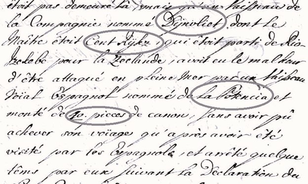 “Un vaisseau de la Compagnie nommé Duynvliet, dont le maître étoit Cent Rijcx, sorti de Rio Essequebo pour la Zéelande, avoit eu le malheur d’être attaqué en pleine mer par un vaisseau royal espagnol nommé la Potencia, monté de 40 pièces de canon…”
